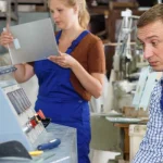 atölye ortamında pah kırma makinesiyle çalışan iki işçi